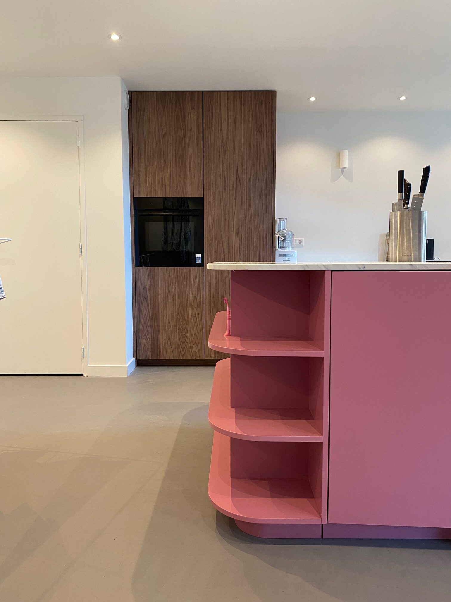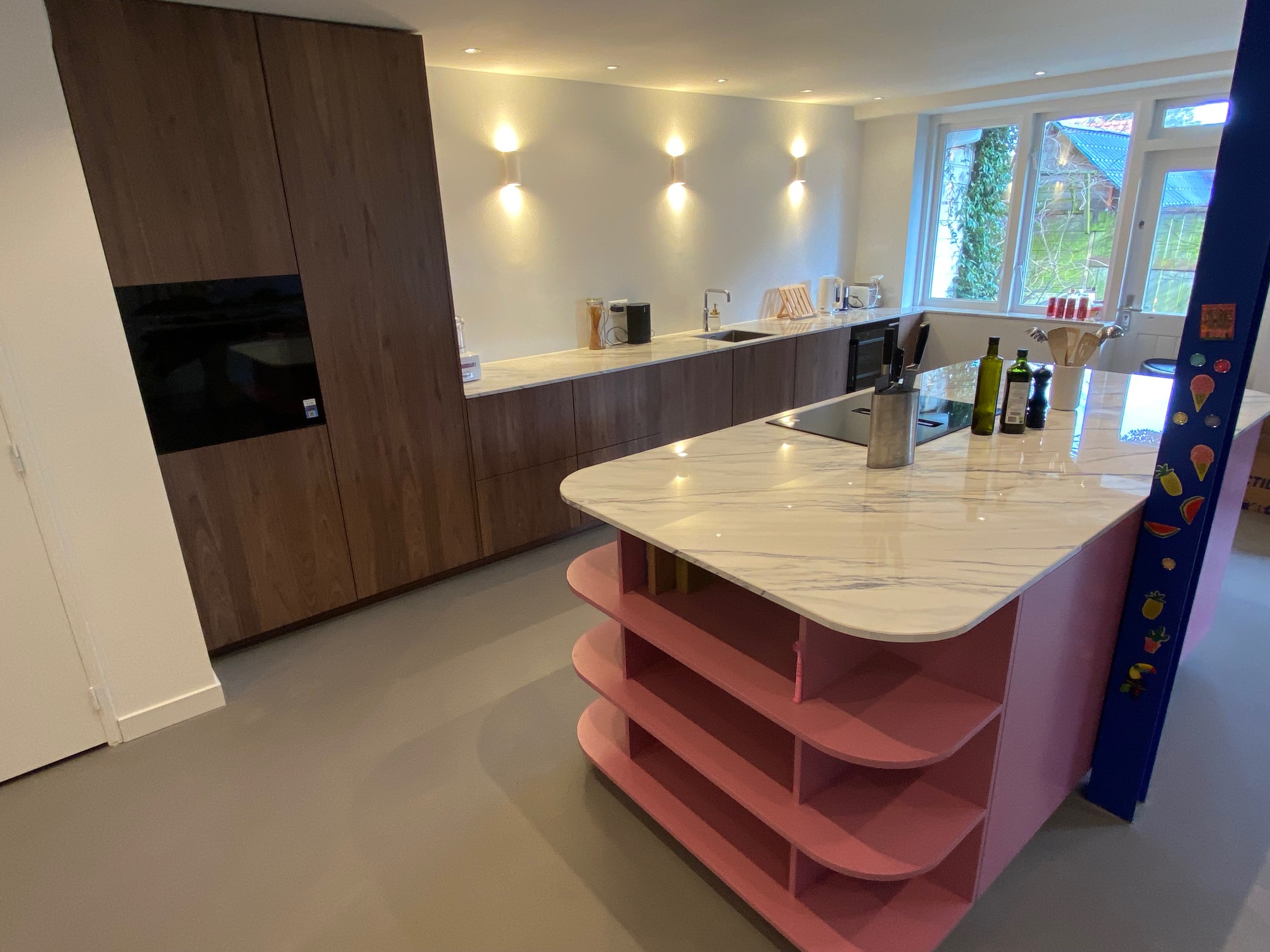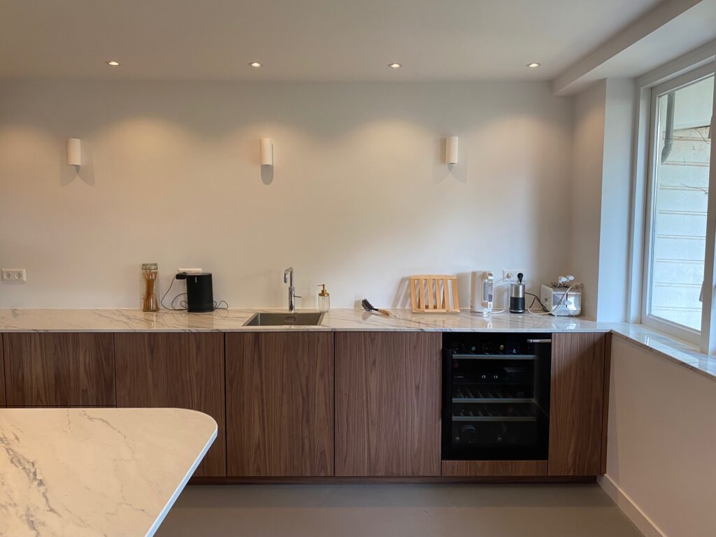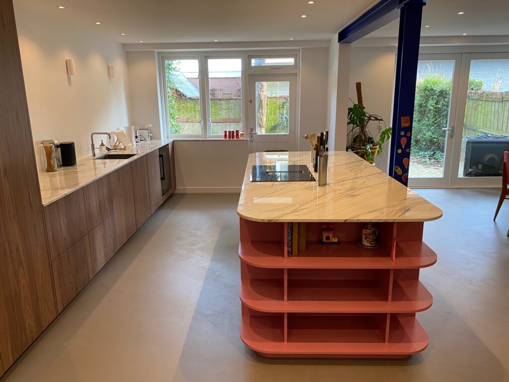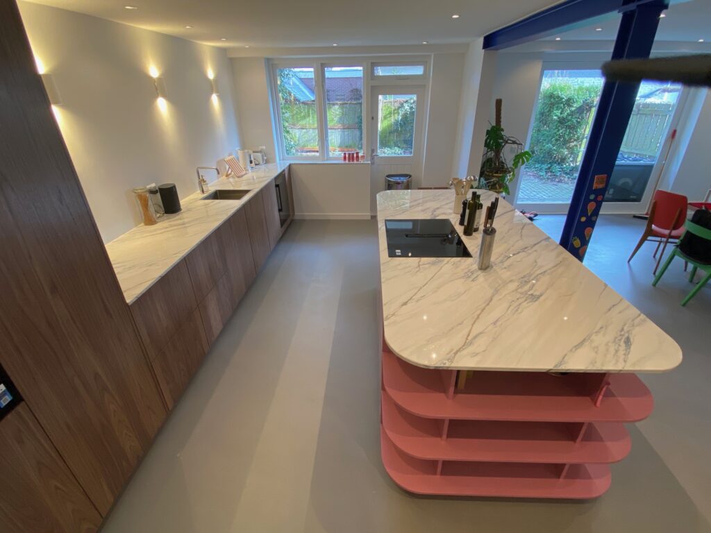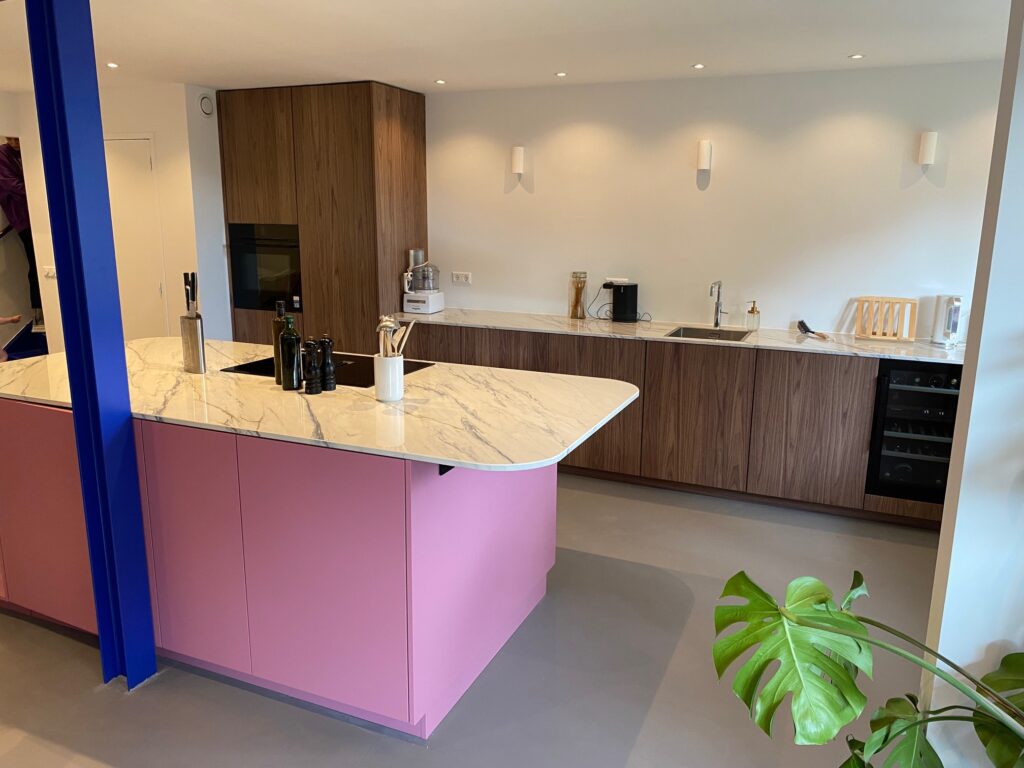 Iets wat we niet iedere dag maken is een roze kookeiland. Onze complimenten aan de klant voor deze gewaagde keuze! Het resultaat, temidden van de strakke, notenhouten, greeploze keuken mag er zijn. En wat te denken van de geautomatiseerde koelkast en vaatwasser? Een klein tikje is al voldoende en de deur opent uit zichzelf. Zo luxe kunnen we het maken!
